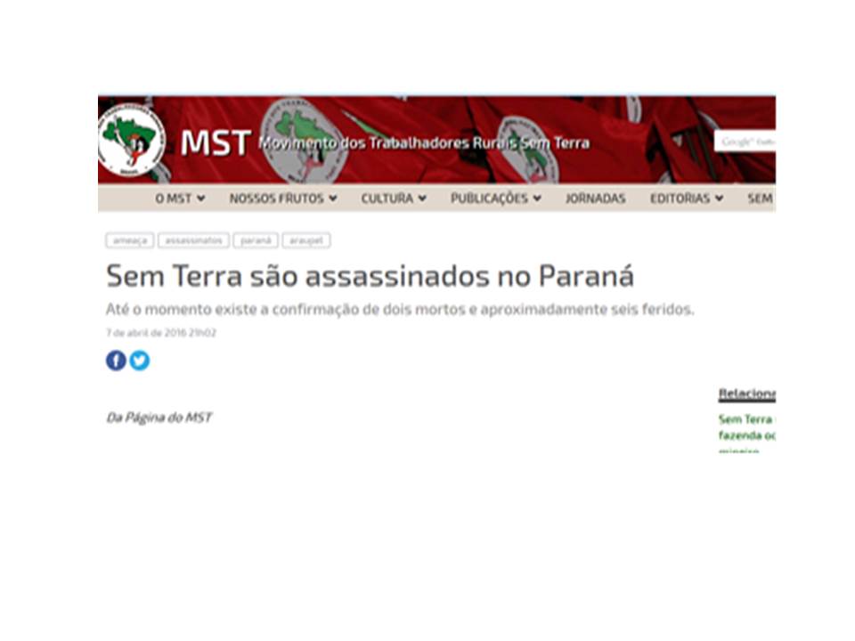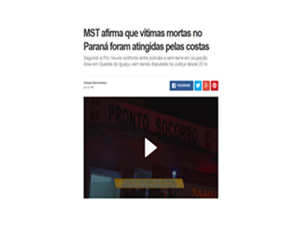 O MST, como outros movimentos sociais, não costuma ser noticiado de forma adequada, fazendo com que os militantes sejam alvo de preconceitos e as agressões recebidas, que acabam sendo naturalizadas. A gravidade desse fato se faz visível na medida em que se reconhece que, ao retratar assuntos de interesse público, o jornalismo exerce influência sobre a sociedade, produzindo discursos que repercutem na formação do imaginário coletivo, muitas vezes consolidando imagens deturpadas. Buscando identificar meios pelos quais dois sites de diferentes tipos de mídia fazem seu enquadramento, foram analisadas quatro notícias – duas do G1 e duas do site oficial do MST – relativas a fatos do dia 7 de abril de 2016, envolvendo a Policia Militar e militantes do MST, acampados em Quedas do Iguaçu, Paraná. Este trabalho tem como premissa que na mídia alternativa ou radical e em estratégias como a Comunicação Para a Paz podem ser encontradas opções à comunicação tendenciosa, abrindo espaço para diferentes grupos e mensagens.