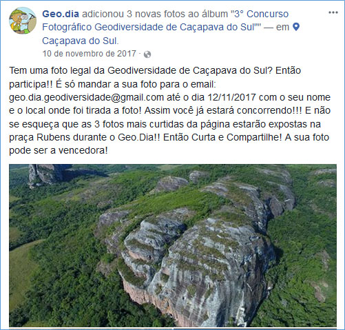 O município de Caçapava do Sul, é a capital gaúcha da geodiversidade. Este título deve-se a importância científica do seu patrimônio geológico. Essas características permitem que sejam desenvolvidas estratégias aliadas ao geoturismo e a geoconservação. Uma das estratégias consiste no Geo.dia. Este projeto visa promover a divulgação e a valorização do patrimônio geológico do município. O Geo.dia, realizado anualmente no mês de novembro, desde o ano de 2015, promove atividades em uma praça ao ar livre, além de organizar saídas a campo nos três principais geossítios do município. Como resultado desta ação, percebe-se uma maior inserção da população no contexto das geociências. Futuramente o projeto Geo.dia poderá servir como base para propostas de Geopark.