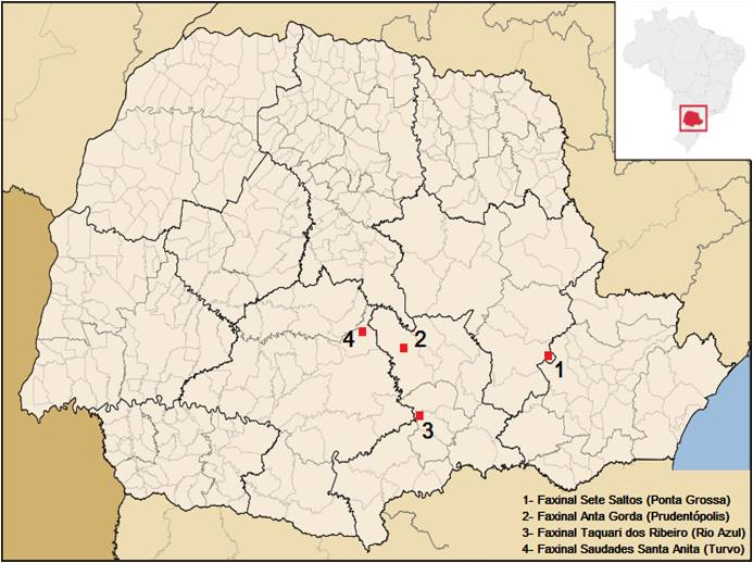 Nos faxinais paranaenses, encontram-se remanescentes representativos da floresta com araucária manejada no Estado do Paraná. O inventário da vegetação do criadouro comunitário do Faxinal Sete Saltos de Baixo, Ponta Grossa, PR, apontou uma floresta impactada (H’= 2,92 e J= 0,78), enquadrada na tipologia de Floresta Antropizada por Sistemas Agrosilvopastoris. Foram levantados 170 indivíduos de 32 espécies e 23 gêneros de 16 famílias. A maior riqueza ocorreu em Myrtaceae, Lauraceae e Salicaceae. As espécies mais frequentes foram Eugenia pluriflora, Myrcia hatschbachii e Cinnamodendron dinisii. As espécies de maior IVI foram Eugenia pluriflora, Cinnamodendron dinisii, Myrcia hatschbachii e Casearia inaequilatera.