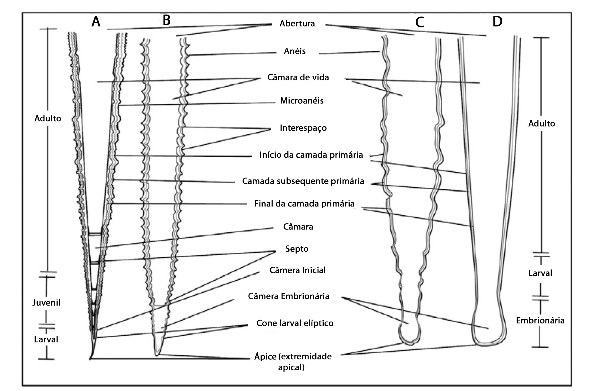 - Figura 2. Representantes da Ordem Tentaculitida (A), Homoctenidae (B) e Dacryoconaridae (C e D). Modificado de Wittmer & Miller (2011).