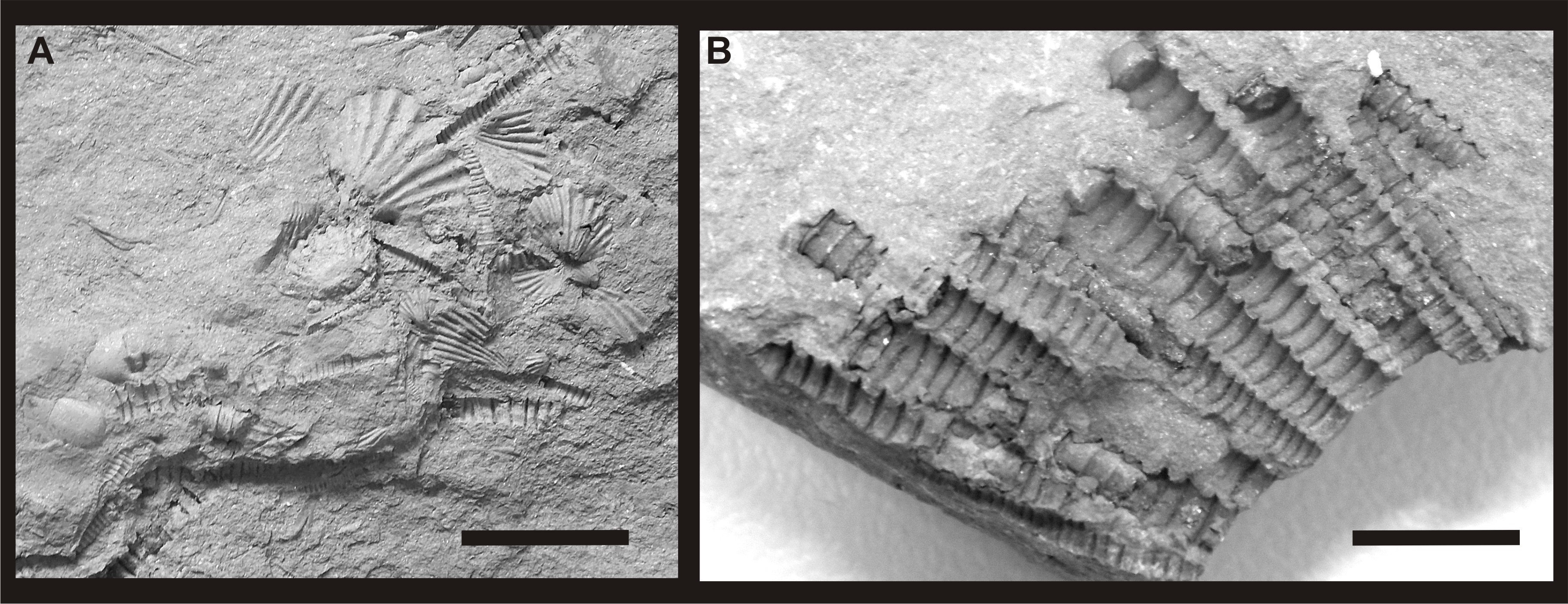 - Figura 4. A) Agrupamento e associações com outros grupos animais e B) Agrupamento de tentaculitideos. Escala de 0,5 cm.